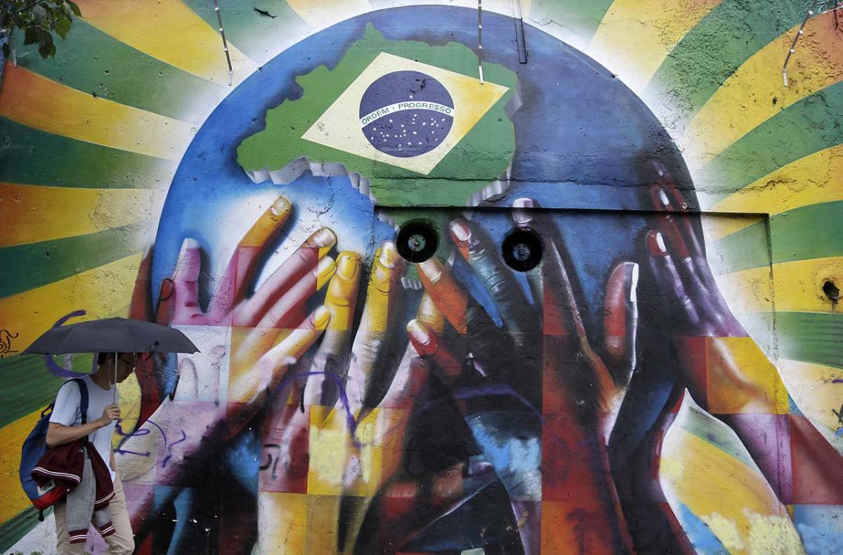 A pedestrian passes a graffiti depicting human hands holding the earth with the Brazilian flag in Sao Paulo on June 10.