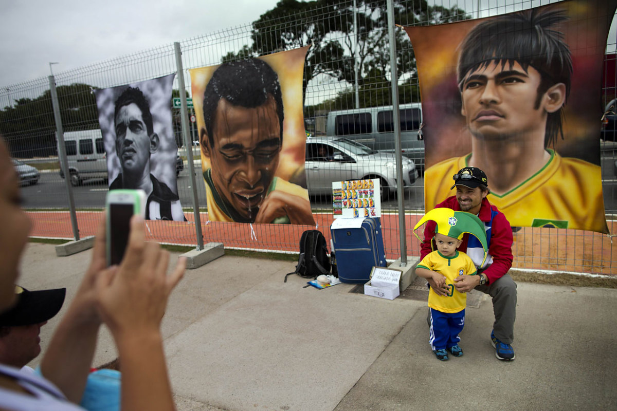 A man poses for the picture with his son next to portraits of Brazilian soccer idols Neymar, right, Pele, center, and Garrincha, left, outside Arena Corinthians stadium in Sao Paulo on June 11.