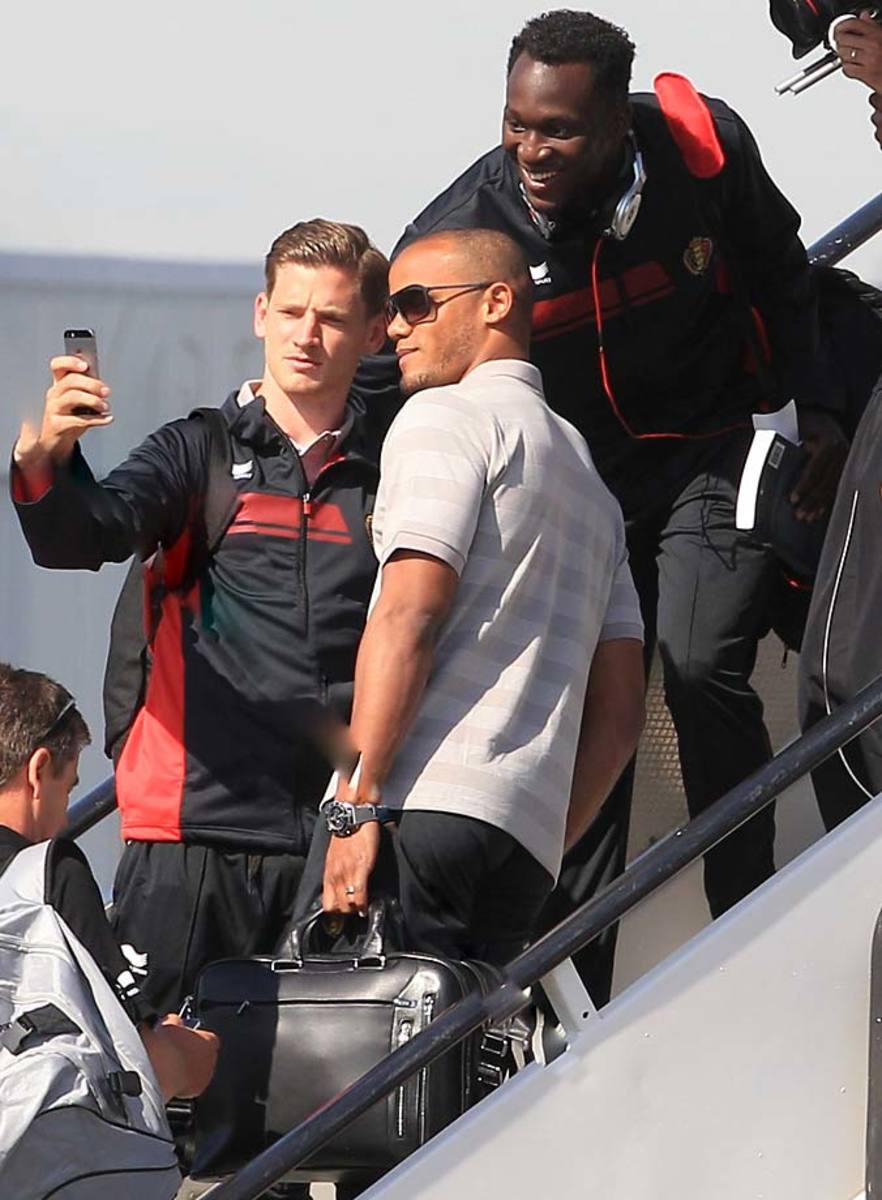 Belgian soccer players Vincent Kompany, center, Romelu Lukaku, top right, and Jan Vertonghen pose for a selfie prior to embarking the plane, departing from Brussels airport to Sao Paulo Brazil on June 10. Belgium will play against South Korea, Russia and Algeria in Group H.