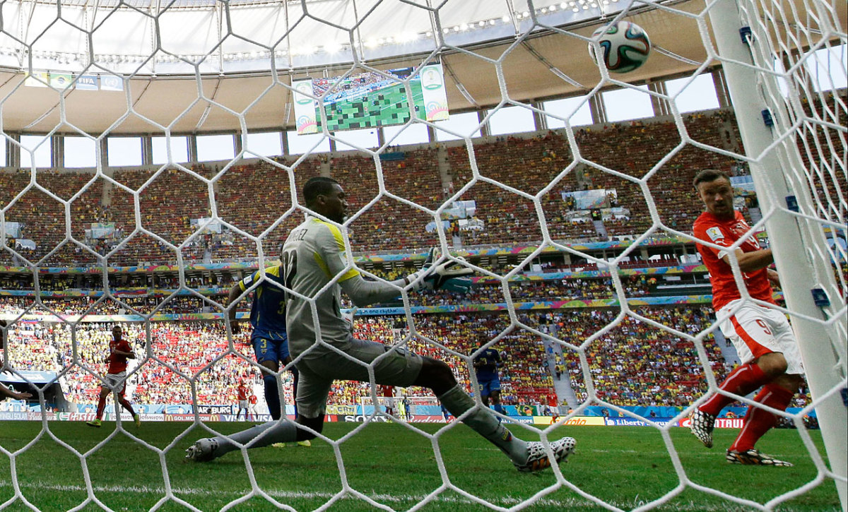 Switzerland's Haris Seferovic scores his side's winning goal past Ecuador's goalkeeper Alexander Dominguez in stoppage time during a 2-1 win on Sunday, June 15, at the Estadio Nacional in Brasilia, Brazil.It was the latest goal scored in a group stage game in World Cup history.