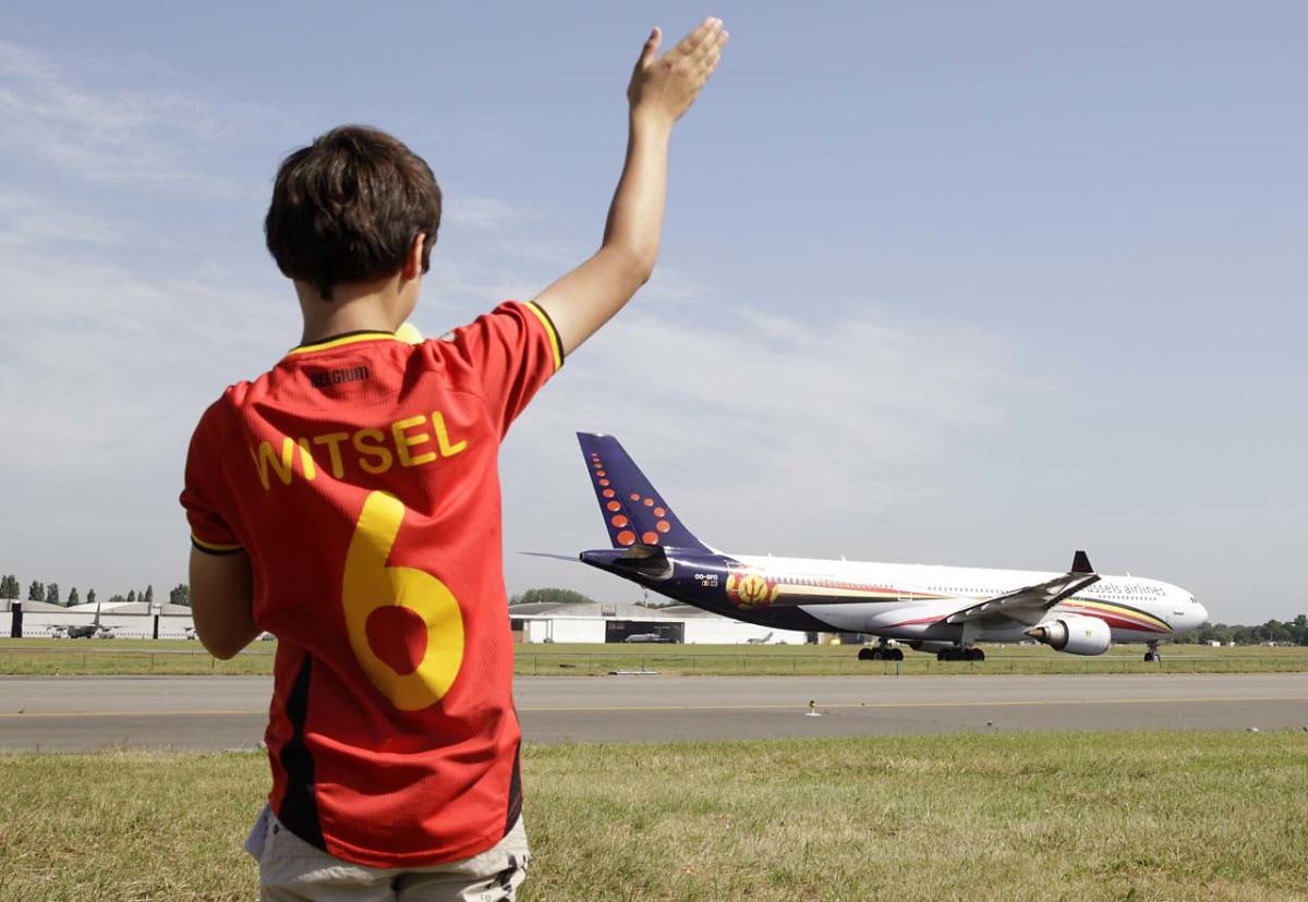 A young soccer fan waves to the plane carrying the Belgian soccer team, departing from Brussels airport to Sao Paulo on June 10.