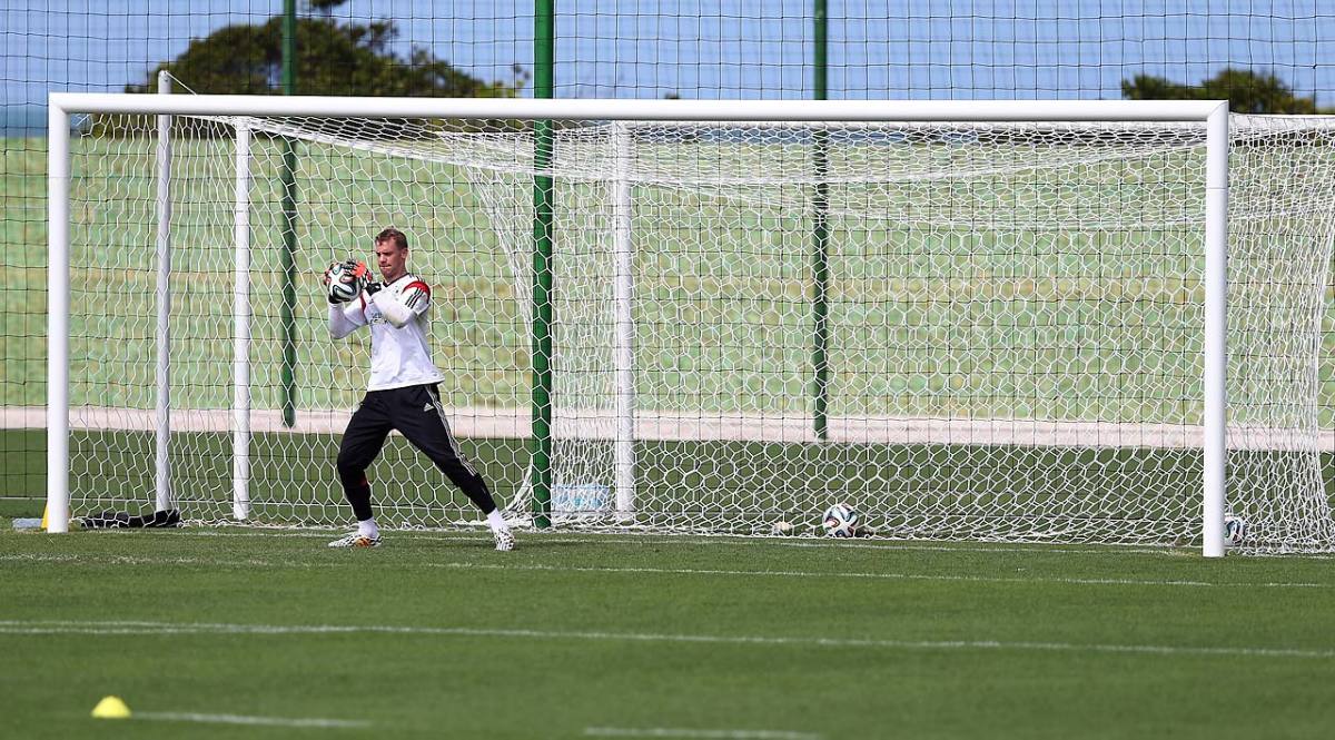 Goalkeeper Manuel Neuer makes a save during the German National team training session at Campo Bahia on June 9, 2014 in Santo Andre, Brazil.