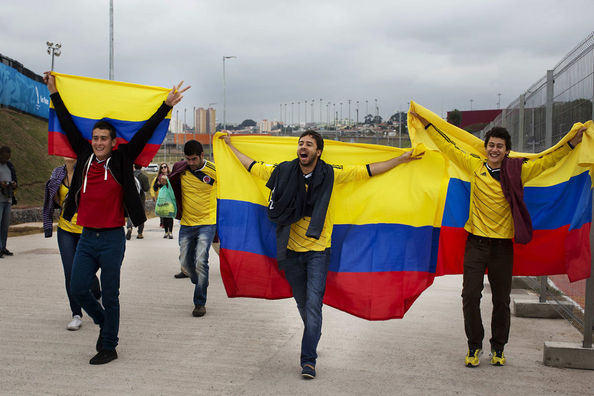 Colombia soccers fans chant slogans with their nation's flag outside Arena Corinthians stadium in Sao Paulo, Brazil on June 11.