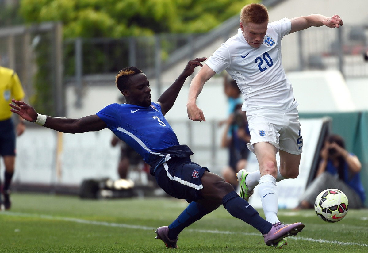 USA defender Boyd Okwuonu makes a tackle on England's Duncan Watmore in the Toulon Tournament third-place game. The U.S. U-23s won 2-1, sealing their best finish in the tournament.