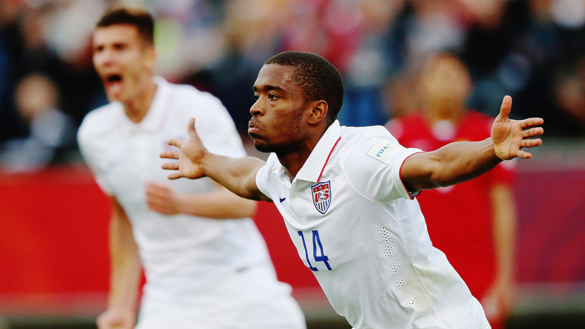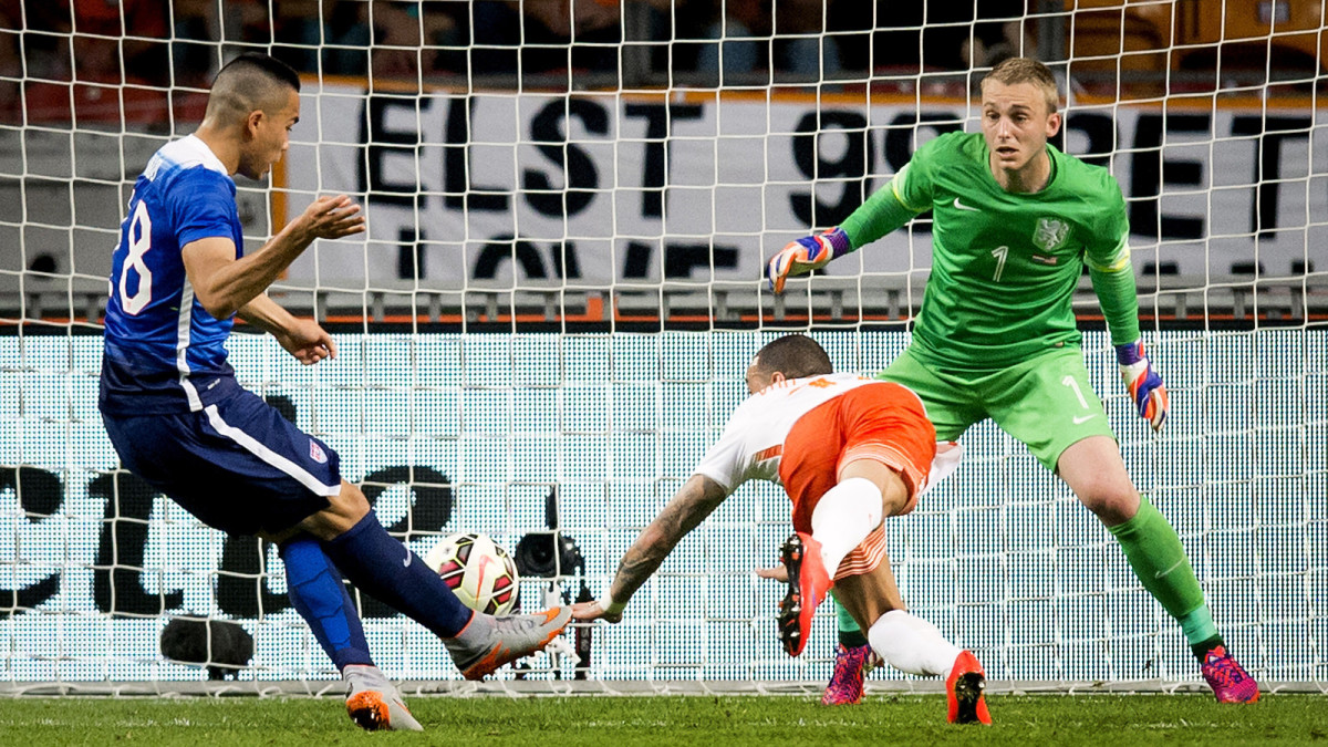DeAndre Yedlin and Danny Williams salute each other after the latter's goal–his first international strike–brought the U.S. level with the Netherlands at 3-3 in the 89th minute.