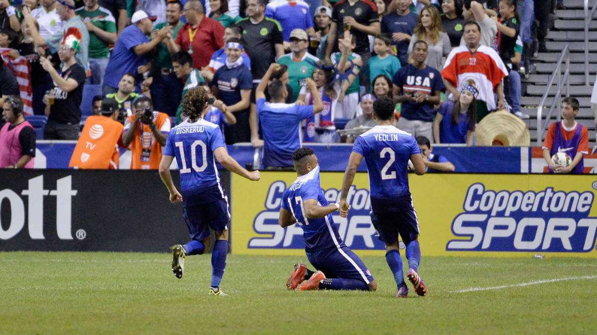 Juan Agudelo collapses to the ground in celebration after his goal at the Alamodome gave the USA a familiar lead over Mexico: Dos-a-Cero.