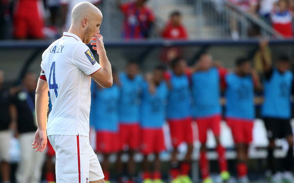 Michael Bradley walks away in dismay after having a penalty saved in a PK shootout in the USA's loss to Panama in the Gold Cup third-place game. After a 1-1 draw, Panama prevailed 3-2 in PKs, the USA's first shootout in 10 years.