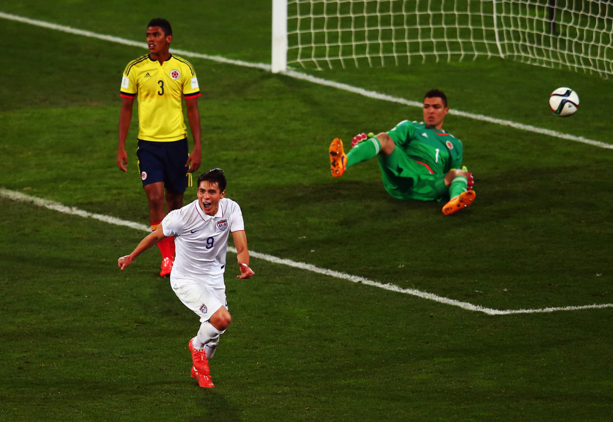 Rubio Rubin celebrates the goal that gives the USA a 1-0 win over Colombia in the FIFA U-20 World Cup round of 16. Zack Steffen's late penalty save preserved the win, as the Americans reached the quarterfinals for the first time since 2007.