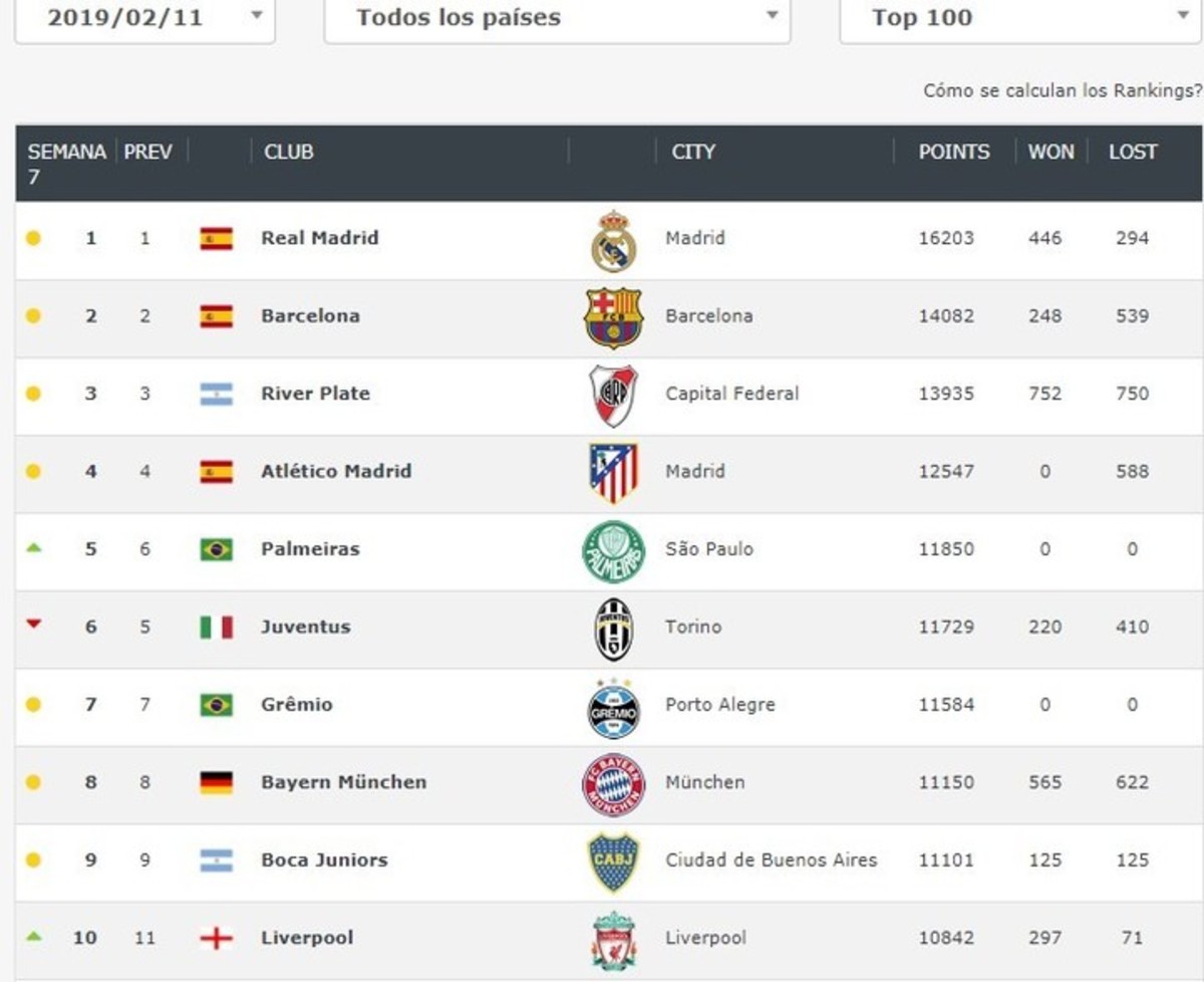 Por lo mencionado anteriormente, River pisa fuerte en todo el mundo. De hecho, el sitio Football World Ranking posiciona a La Banda como el tercer mejor equipo del planeta. En segundo lugar figura Barcelona y primero está Real Madrid.