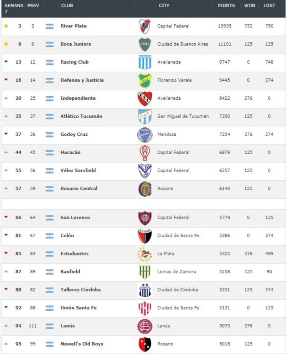 En el top 20 aparecen otros tres equipos argentinos. Racing y Defensa y Justicia, los punteros de la Superliga, que figuran 13° y 16°, respectivamente, e Independiente, que se coloca en la 20° posición. Los otros argentinos en el top 100: Atlético Tucumán(35°), Godoy Cruz (37°), Huracán (44°), Vélez (55°), Rosario Central (57°), San Lorenzo (66°), Colón de Santa Fe (81°), Estudiantes (85°), Banfield (87°), Talleres de Córdoba (88°), Unión de Santa Fe (92°), Lanús (94°) y Newell's Old Boys de Rosario (95°).