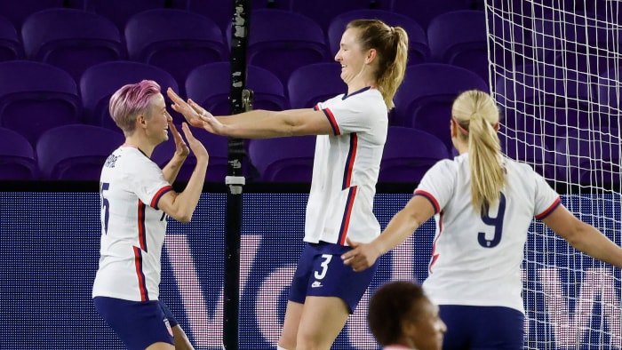 Carli Lloyd and Megan Rapinoe played their first minutes—for any team—since March 11, 2020, after sitting out the 2020 NWSL season and the U.S.'s fall camps for injury recovery and rest. With forwards Christen Press (on loan at Manchester United), Tobin Heath (also on loan at Man United) and Alex Morgan (COVID-19) all absent for this January camp, Lloyd and Rapinoe both earned starts on Monday, with Rapinoe playing the first half and Lloyd going a full 90.