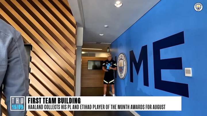Go behind the scenes at Manchester City to see Erling Haaland pick up the player of the month award for August.
