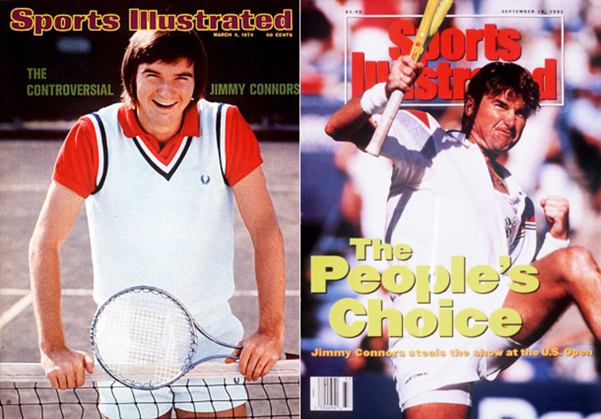 Jimmy Connors appeared on his first SI cover in 1974 and his most recent in 1991. (Tony Triolo/SI; Caryn Levy/SI)