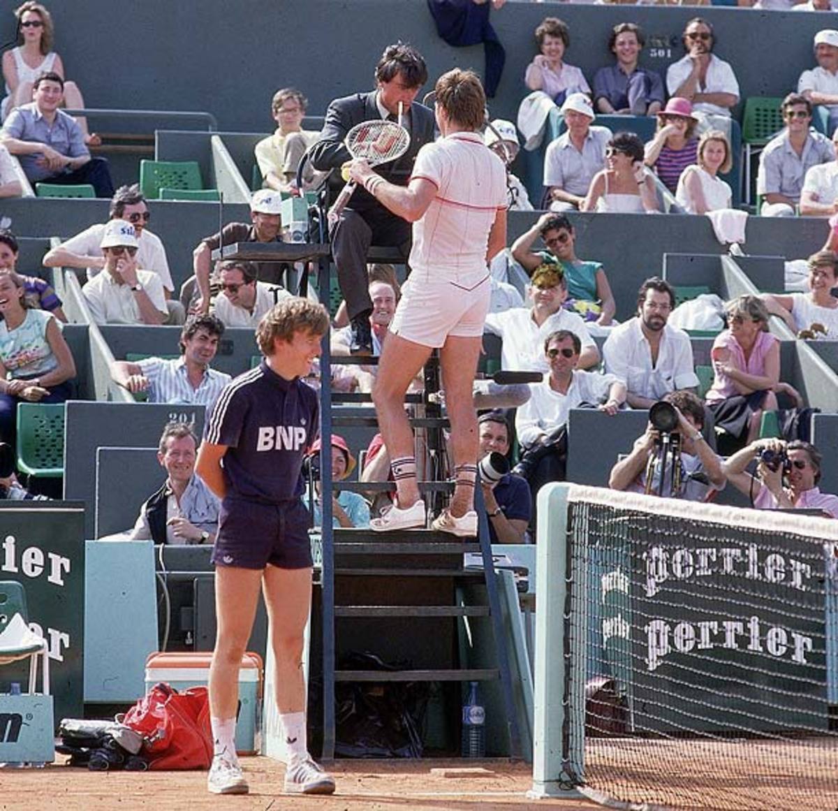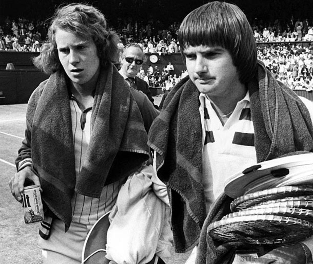 Connors and John McEnroe: The first time Connors laid eyes on McEnroe was in the men's locker room at Wimbledon before their 1977 semifinal. "He looked like the Pillsbury Doughboy with a headband," Connors wrote. "I had to ask myself, how the hell did he even qualify?" Connors won 6-3, 6-3, 4-6, 6-4. (Bride Lane Library/Popperfoto/Getty Images)