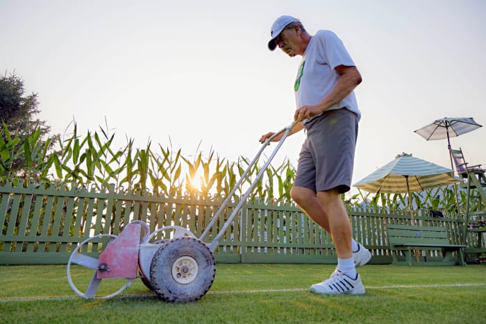 There are a handful of sites with grass courts across the country, including the International Tennis Hall of Fame in Newport, R.I., and the West Side Tennis Club in Forest Hills, N.Y., once home to the U.S. Open. But most are private, and only the All Iowa, with its ubiquitous shades of purple and green, is designed to evoke the Grandest of Slams. Kuhn’s court is a perennial ryegrass, the blades of choice at the All England Club. He draws the lines with a white titanium-based compound, same as SW19, keeping them straight with a Wimbledon-approved method involving a string and stakes. It’s an hour of maintenance a day, minimum, and the weekly total runs closer to 12. “There’s the Wimbledon way—that’s the way they do it,” Kuhn says with admiration. “And it takes a lot of work.” He learned that firsthand in 2012 during an internship with the Wimbledon grounds staff, where he finally saw with his own eyes the court he had re-created a decade earlier.