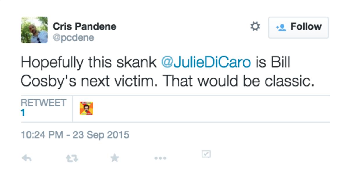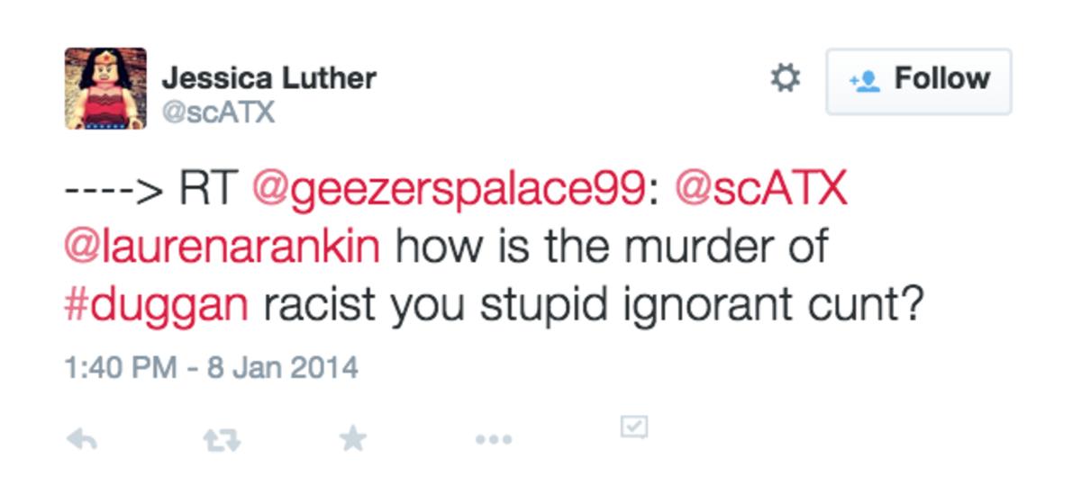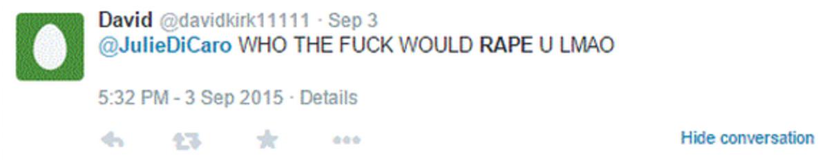 While it’s tempting to write off the men who send violent and demeaning tweets with a “don’t feed the trolls” mantra, there is something larger at work here. Simply observe hashtags such as #isupport88 and communities like Florida State Twitter any time Jameis Winston’s name comes up, and you’ll see a steady drumbeat of threats, obscene names, and in some cases, a plainly stated desire for rape and retribution. Add in that many accounts used to harass women are either newly created for that express purpose or run by people who systematically delete the tweets after they hit their mark (thus the need to take screenshots to preserve them), and you get a better understanding of the mentalities involved.