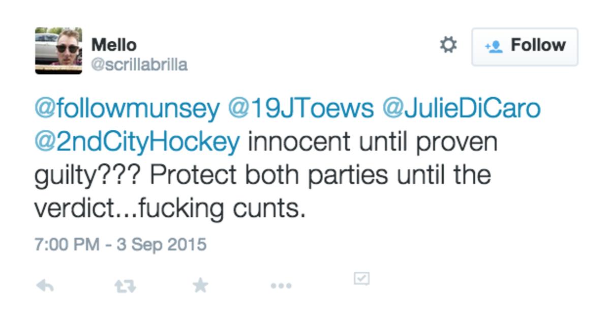 Nine years later, in the midst of the Patrick Kane rape investigation, I found myself working from home Friday, having received a threat on Twitter that hit a little too close to home.