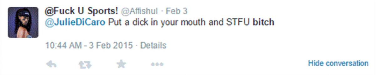 “I’ve been called a whore, a black bitch, a nigger, a monkey, an Uncle Tom, and had my sexuality questioned,” said Hill, unable to decide the worst thing she’s ever been called on Twitter. While she learned to cope with the online venom by being “quick with the block button,” Hill agrees that women are lightning rods for a special breed of nastiness on sports Twitter. “Women who are confident, assertive and opinionated are resented in every sector of society. The difference is that the relative anonymity of social media empowers the trolls to say things to women that they wouldn’t dare say if they were before us in person.