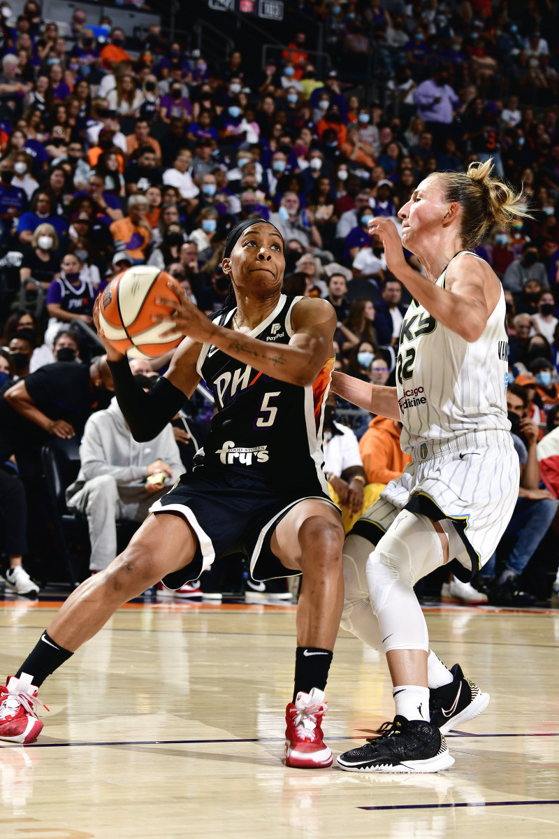Diggins-Smith and her backcourt mate spent almost the entirety of last offseason training together. Starting around New Year’s, the duo worked out at least five days a week, initially at a Phoenix-area YMCA before transitioning to the team’s practice facility. “Iron sharpens iron,” Diggins-Smith says. “And I feel like we’re cut from the same cloth as far as how competitive we both are, how we want to win.” The extra work paid off as the duo recorded a +13.1 net rating in the regular season, the most of any Phoenix pair that played at least 50 minutes. Diggins-Smith flourished with Griner, as well, emerging as one of the league’s top guard-big combinations.